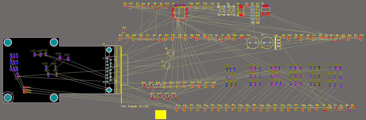 Yukarıdaki resim bir devre kartı tasarım programının şu anki çalışma penceresi. Benim işim, şu sıcak yaz akşamında, dışarıdaki tüm elemanları siyah alanın içine doğru sırada yerleştirmek ve aradaki bağlantıları yapmak.