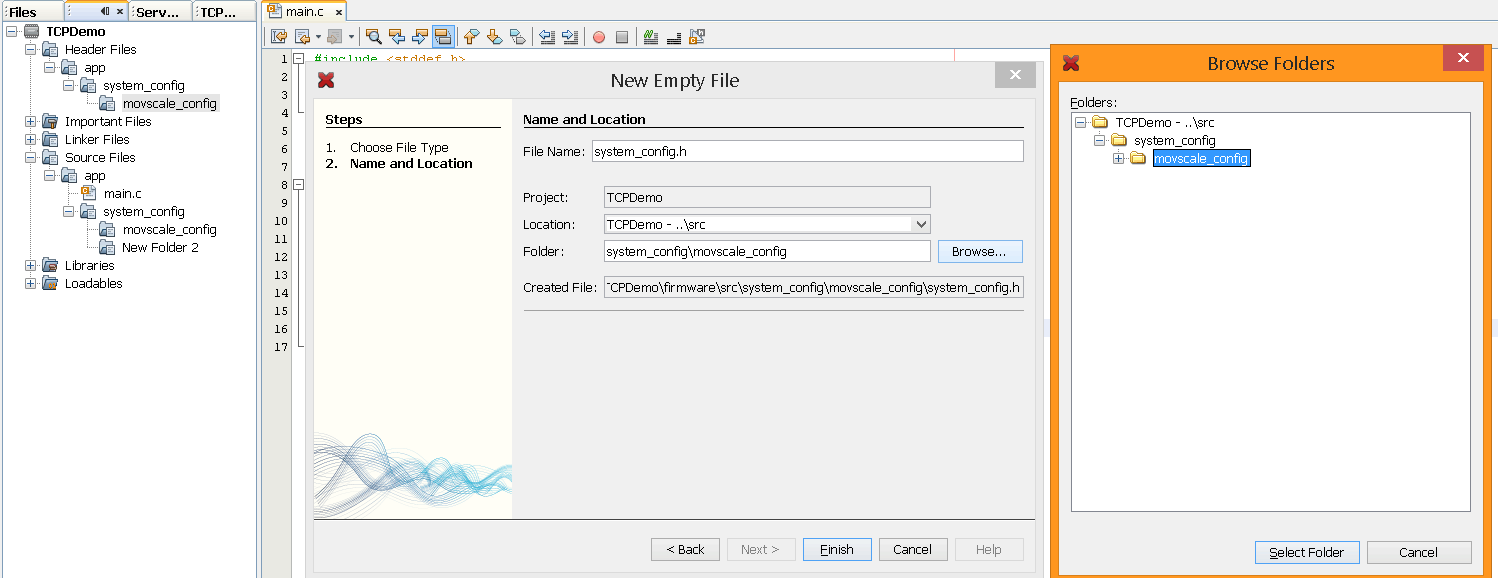 Proje içinde bunları oluşturmamız gerekiyor. Tam konumu ne olacak diye sorarsanız, app/system_config/movscale_config logical folder’larının içinde olacak. Folder’lar diyorum çünkü .h’leri Header Files altında .c’leri Source files altında oluşturacağız.