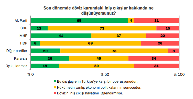 Yukarıdaki yazıyı ve grafiği iki ay kadar önce, yani TL asıl çöküşünü yaşamadan evvel kaydetmişim. Burayla pek ilgilenemedim bir süredir. Şimdi temizlik yaparken dikkatimi çekti. Ama buna bakınca o zamanki kadar komik durmuyor. Yazıya ekleme yapayım derken yapacağım yorum artık AKP seçmeninin durumu ile alakalı olmayacak. Nedense bugün bakınca CHP seçmenlerinin %12’sinin dövizin yükselmesini dış güçlerden sebep görmesi, %15’inin de döviz beni ilgilendirmiyor demesi AKP’lilerin bilindik ve de alışıldık durumundan daha ilginç gözüktü bana.