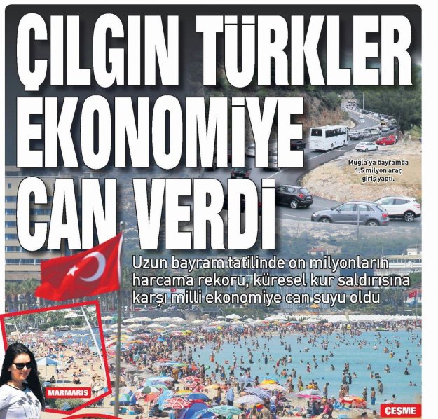 Aşağıdaki gazete sayfasını bu yaz kaydetmiştim. Doların patladığı, şimdi en aptallarımızın bile iyice hissetmeye başladığı krizin üstümüze çöktüğü dönemdi. İnsanını nasıl güdeceğini iyi bilen iktidar, tatilleri uzatıp, birleştirip, karşısına aldığı %48’e son bir harcama seferberliği yaptırmıştı. Aşağıdaki “yandaş” manşeti durumu çok iyi özetliyor. Seneye yıl sonunda alkol ÖTV’sinden 25 milyar TL gelir elde edildiği haberini de bu başlıkla verebilirler bence.