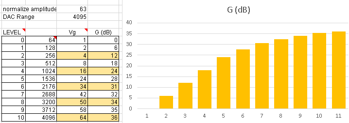 İkinci nokta, DAC sayısal değerimizle ilgili. Ben bir dalga şekli tanımlarken onu 0..64 gibi bir aralıkta normalize ederek üretiyorum. Eğer donanımsal değil, yazılımsal genlik ayarı yapmak isterseniz bu 0..64 aralığını 0dB kabul edip, sample değerlerini istediğiniz bir sabitle çarpıp, anlık bir çıkış genliği üretirsiniz.