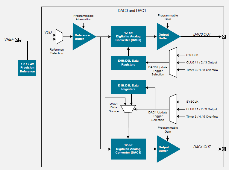 EFM8’de 4 kanal DAC var. Bunlar iki çift olarak kullanılıyor gibi gösterilse de tamamen bağımsız çıkışlar olarak kullanabiliyorsunuz. Bir çifti, birbirinin aynı ya da eşlenik çıkış üretmek istersek beraber kullanabiliriz. DAC çözünürlüğü 12 bit.