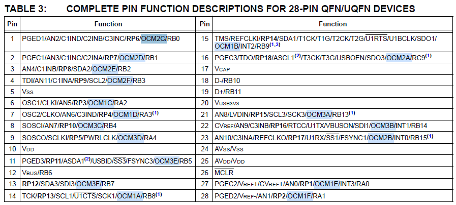 Aslında PIC32MM çiplerinde pin remap fonksiyonu “peripheral pin select” adıyla var. Ancak ilk üç capture/compare modülü için serbest pin ataması yapılamıyor. Bunlar aynı zamanda birden çok çıkışla kullanılabilen modüller. Bu çıkışların yerleri sabit. Örneğin, QFN28 kılıf olan versiyonda Output-Compare çıkışlarının hangi pinlerle paylaşıldığını aşağıda görüyorsunuz: