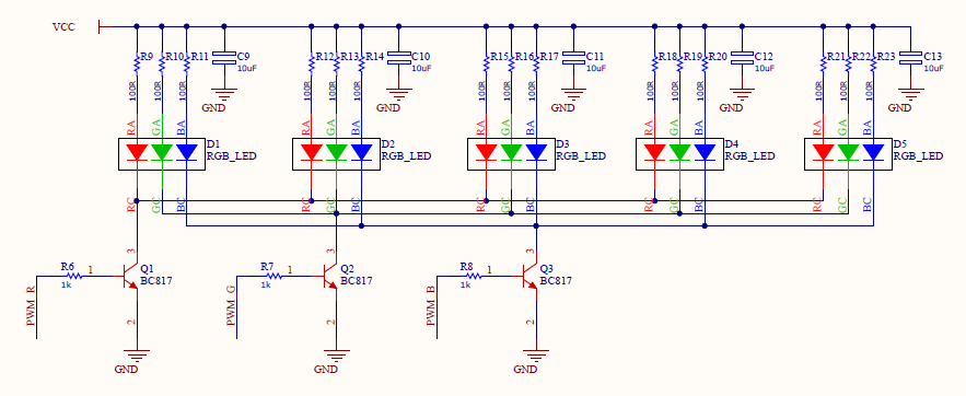 LED’leri doğrudan kartların besleme hattı üzerinden besliyorum ve her renk için bir pull-down transistör ile sürüyorum. Şemada 100R olarak gözüken seri dirençler besleme gerilimine göre seçilmesi gereken denge dirençleri.