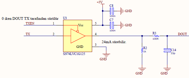 Modülleri arka arkaya (kaskat) bağladığımızda soldan sağa birbirlerini sürmüş olacaklar.Bir modül sol tarafından bir paket aldığında bu paket onu adreslemiyorsa veya bir genel çağrı adresi taşıyorsa o komutu sağ taraftaki TX pininden aktaracaktır. 0-3V gerilim düzeyinde çalışıyor olsak bile bu şekilde alavere yaparak uzun bir lamba zincirini bir uçtan kumanda edebilmeyi umuyorum. Bu arada, 24mA kaynak akımı verebilen bir logic buffer kullanmakla sonraki modül ile aramızdaki kablonun kapasitesinden kaynaklanacak yavaşlamaları azaltmış olacağız. Şemadaki paralel kondansatöre takılmayın. Orada bir komponent yeri olsun istedim sadece.